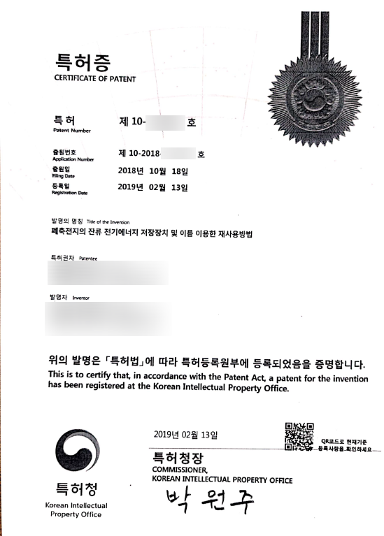 | 1 | 폐축전지의 잔류 전기에너지 저장장치 및 이를 이용한 재사용방법 | 대한 민국 |